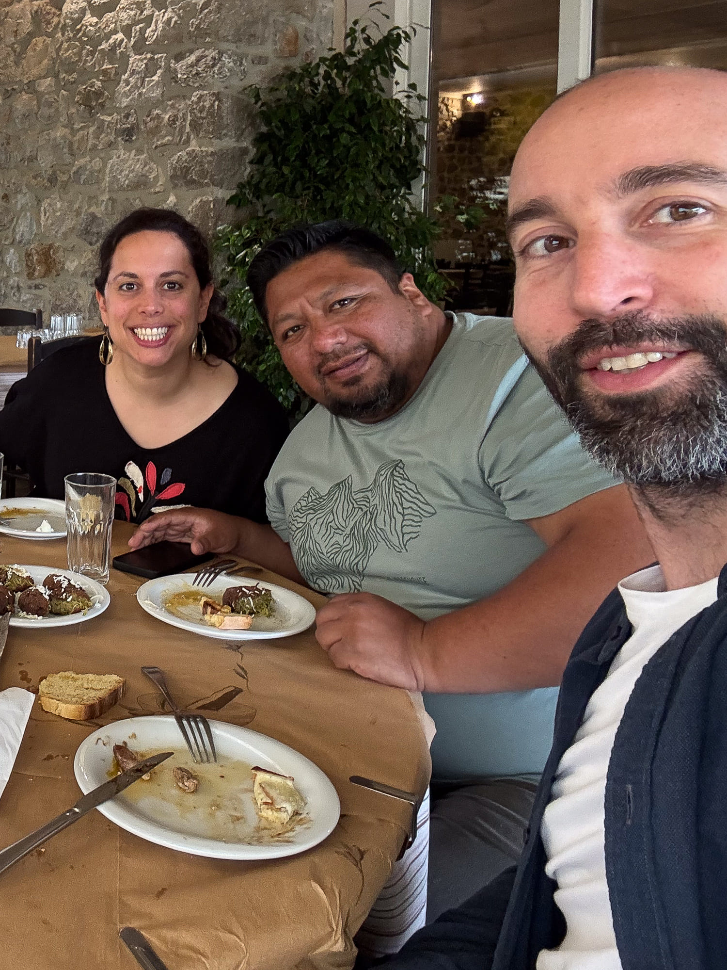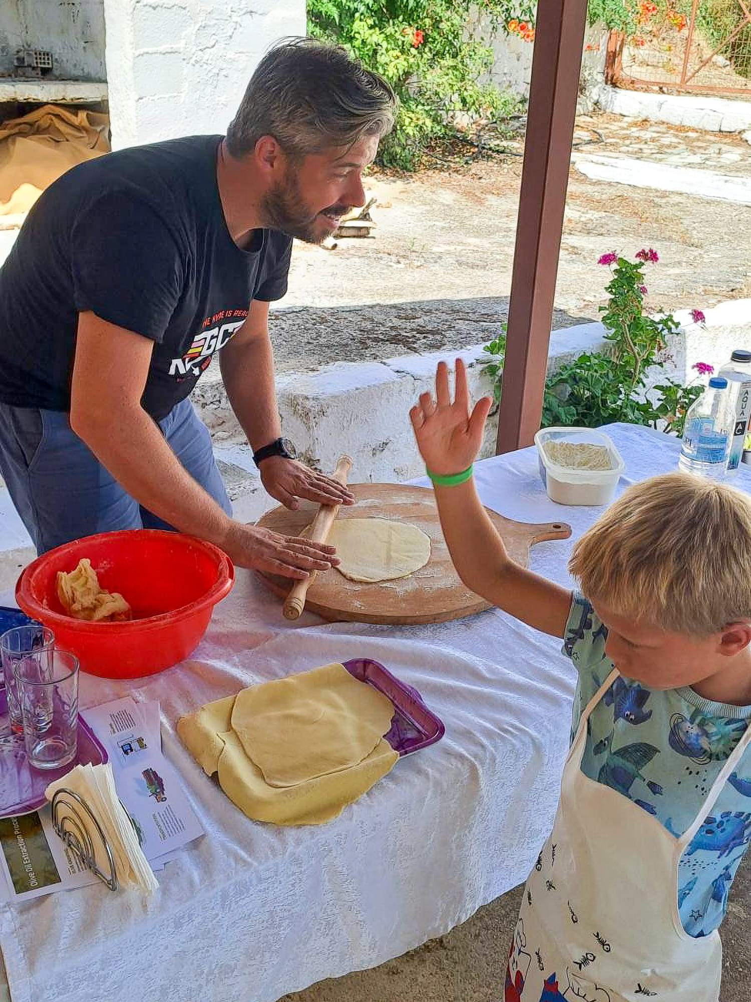 The day culminates in a hands-on gastronomic workshop. Depending on the season and your preference, you will join a local family to make traditional Feta cheese pie or "Gogges" (local handmade pasta). Under the shade of Greek blue sky, we share a lunch of local products, experiencing food as memory, survival, and community. We end our day with a shared pause for Greek coffee, reflecting on the generations of stories that have walked these same paths.
